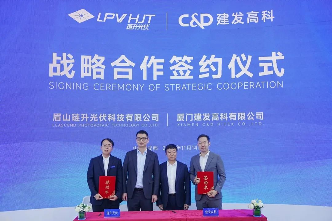 琏升光伏与厦门建发高科有限公司签署合作框架协议。琏升光伏总经理唐旋、建发高科总经理詹胜利上台签约。建发高科作为建发股份单位核心企业,以高端制造和新能源为双主业,贯穿全产业链,此次与琏升光伏签约合作,将进一步拓宽琏升光伏异质结产品营销渠道,双方优势互补,共同提升在新能源市场的影响力。